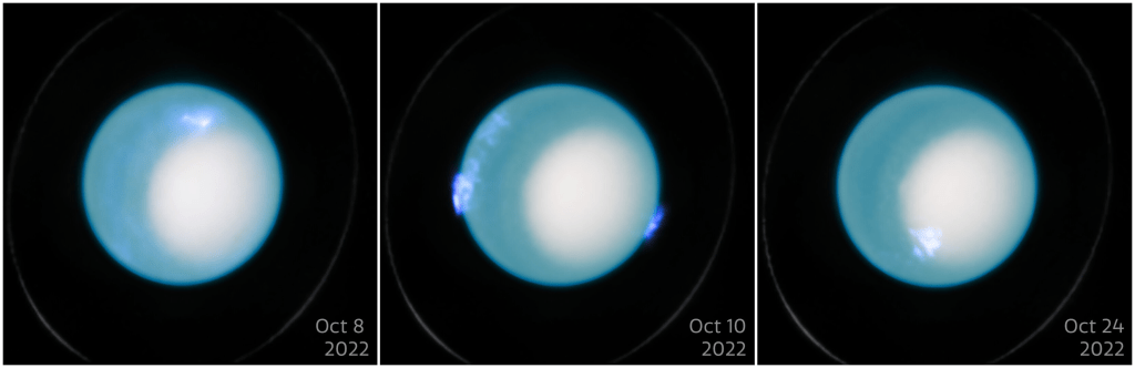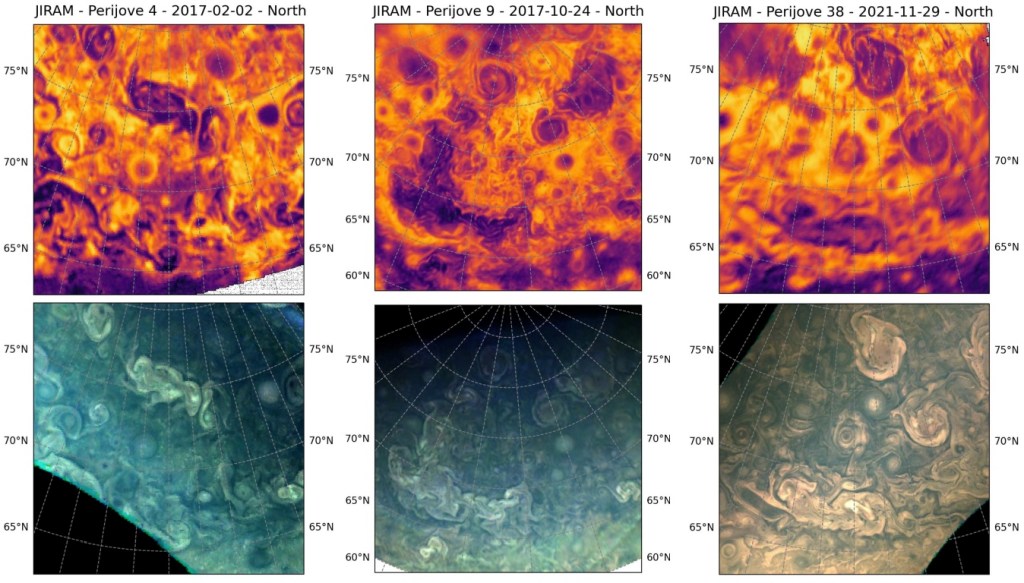 Figure : Projections orthographiques des images des instruments JIRAM autour de 5 microns (haut) et JunoCam dans le visible (bas) prises par la sonde Juno autour de Jupiter entre 2017 et 2021.