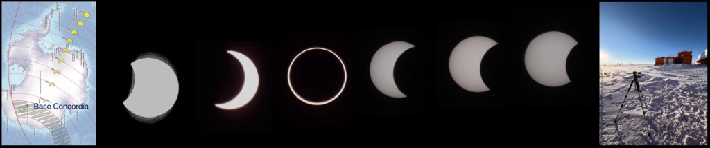 L’éclipse de soleil annulaire du 17 février 2026: A gauche: Trajet de l’éclipse (Crédits: Michael Zeiler/EclipseAtlas); Centre: Montage de photos de l’eclipse prise depuis la base Antarctique de Concordia (Crédits: PNRA/IPEV/A. Traverso); Droite: Installation à Concordia (Crédits: PNRA/IPEV/S. Gaier)